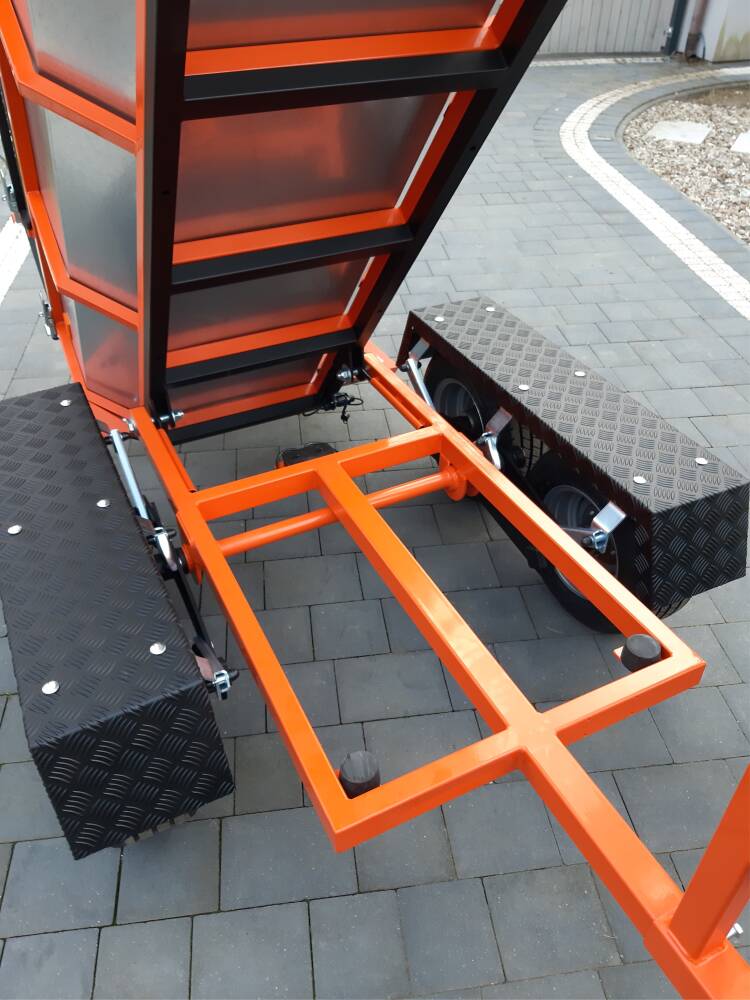 - Funkcia 3 v 1: Celá korba je odnímateľná. Vďaka špeciálnemu dvojitému rámu je možné po jej demontáži na ráme prepravovať drevo pomocou nasadzovacích kovových klaníc.